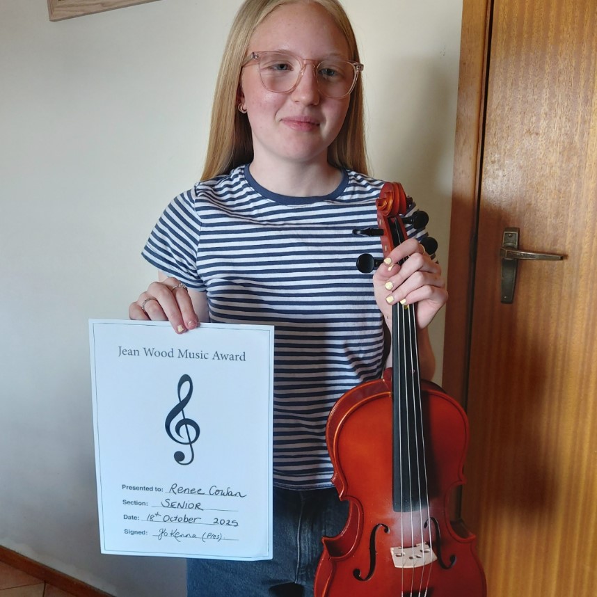 to viola student, Renee Cowan who has won the 2025 Jean Wood Music Scholarship Award Senior Prize! Renee had to play two pieces and be interviewed by a panel.